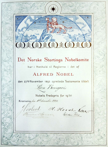 Le diplôme du prix Nobel de la paix au nom de Léon Bourgeois [Musées de Châlons-en-Champagne, inv. 926.7.139 (2)] (c) musées de Châlons, photo G. Himber