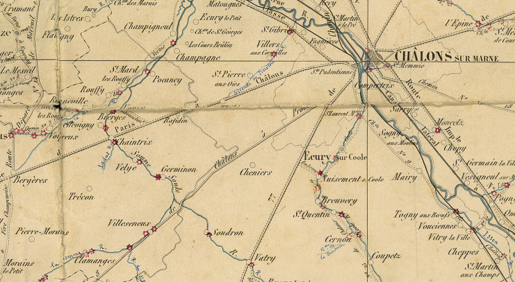 Extrait de la carte routière du département de la Marne comprenant les routes impériales et départementales, les chemins de fer, les canaux..., dressée et présentée par l'ingénieur en chef le 24 octobre 1873 (7 S 251)